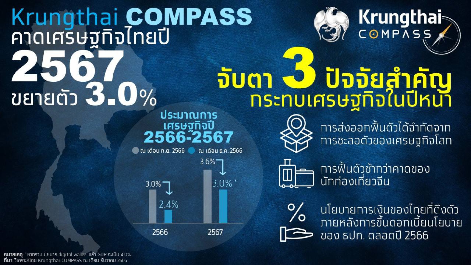 21 ธ.ค. 2566 ดร.พชรพจน์ นันทรามาศ ผู้ช่วยกรรมการผู้จัดการใหญ่และ Chief Economist ธนาคารกรุงไทยเปิดเผยว่าศูนย์วิจัย Krungthai COMPASS คาดว่าเศรษฐกิจไทยในปี 2566 จะขยายตัวได้ 2.4% ต่ำกว่าประมาณการเดิมที่ 3% ปัจจัยหลักจากจำนวนนักท่องเที่ยวต่างชาติที่คาดว่าจะเข้ามาเพียง 27.5 ล้านคนจากคาดการณ์ราว 30 ล้านคนส่งผลให้รายได้จากนักท่องเที่ยวต่างชาติหายไปประมาณกว่า 1 แสนล้านบาท