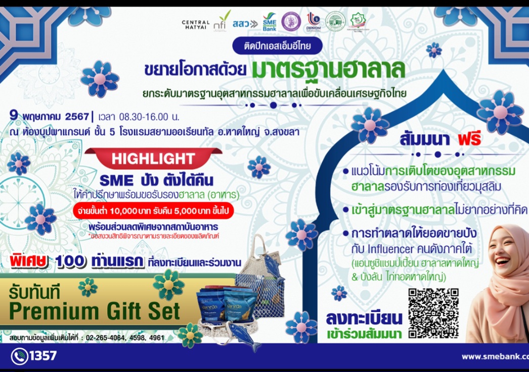 นโยบายรัฐ ยกทัพ เติมทุนคู่พัฒนา ดันฮาลาลไทยสู่ตลาดโลก ธนาคารพัฒนาวิสาหกิจขนาดกลางและขนาดย่อมแห่งประเทศไทย (ธพว.) หรือ SME D Bank ผนึกกำลังกระทรวงอุตสาหกรรม และหน่วยงานพันธมิตร ภาครัฐและเอกชน จัดมหกรรมยิ่งใหญ่ติดปีกเอสเอ็มอีไทย ขยายโอกาสด้วยมาตรฐาน ฮาลาล สนับสนุนภาคอุตสาหกรรมและผู้ประกอบการเอสเอ็มอีใน พื้นที่ภาคใต้ ยกระดับและเพิ่มศักยภาพด้วยมาตรฐาน ฮาลาล รองรับความต้องการผู้บริโภคอาหาร ฮาลาล ทั่วโลกมูลค่ากว่า 2 ล้านล้านดอลลาร์สหรัฐฯ ช่วยสร้างโอกาสและขับเคลื่อนอุตสาหกรรม ฮาลาลไทย สู่ตลาดโลก ผลักดันเศรษฐกิจไทยเติบโตอย่างเข้มแข็งยั่งยืน กำหนดจัด วันที่ 9 พฤษภาคม 2567 เวลา 08.30-16.00 น. ณ ห้องบุปผาแกรนด์ ชั้น 5 โรงแรมสยามออเรียนทัล อำเภอหาดใหญ่ จังหวัดสงขลา