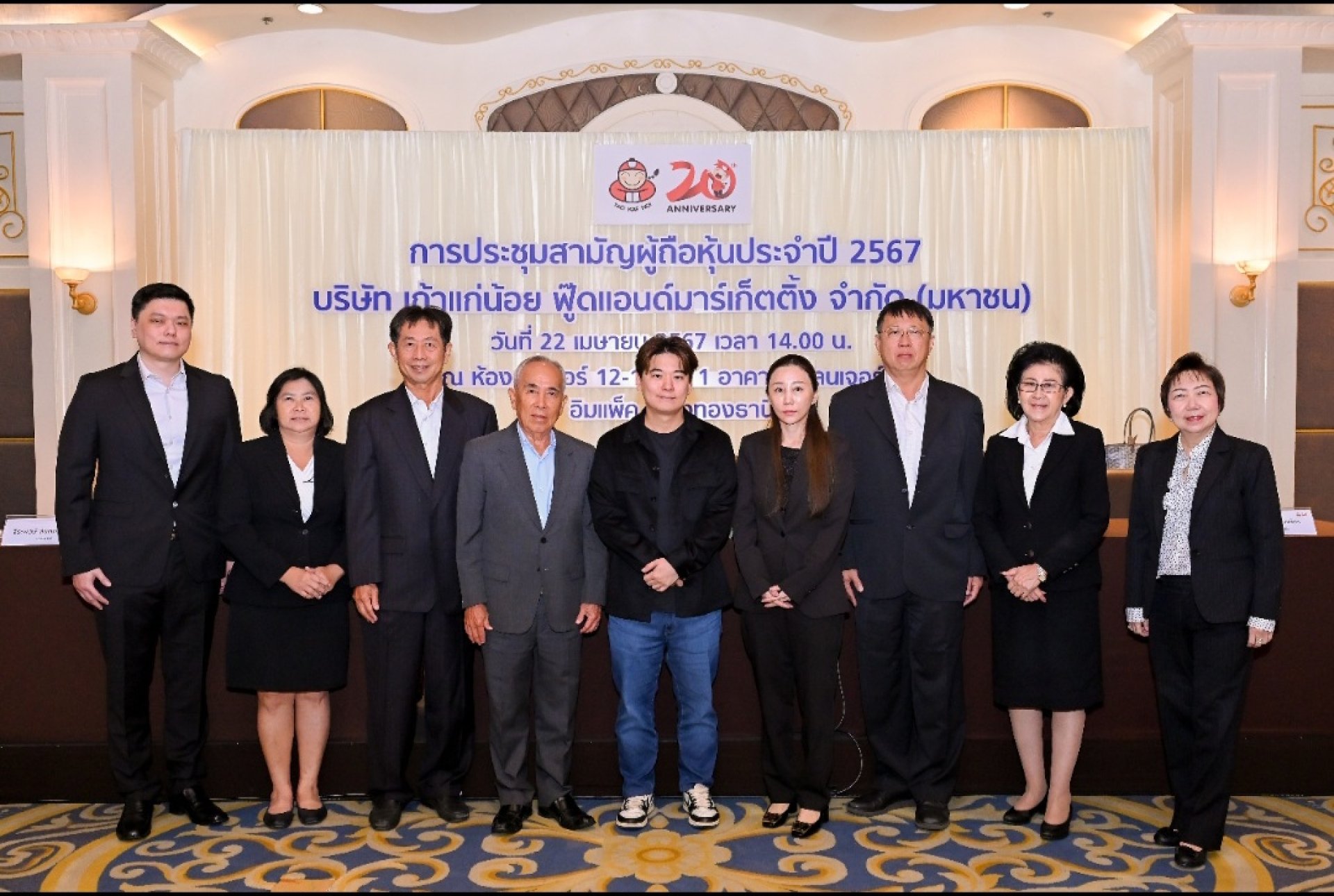 นายยุทธ วรฉัตรธาร (ที่ 4 จากซ้าย) ประธานกรรมการ และนายอิทธิพัทธ์ พีระเดชาพันธ์ (กลาง) ประธานเจ้าหน้าที่บริหาร พร้อมคณะกรรมการ และผู้บริหาร บริษัท เถ้าแก่น้อย ฟู๊ดแอนด์มาร์เก็ตติ้ง จำกัด (มหาชน) หรือ TKN ร่วมประชุมผู้ถือหุ้นสามัญประจำปี 2567 โดยที่ประชุมอนุมัติงบการเงินปี 2566 ที่มีรายได้จากการขาย 5,323.4 ล้านบาท สูงกว่าช่วงก่อนเกิดโควิด-19 และมีกำไรสุทธิ 743 ล้านบาท สูงสุดในรอบ 6 ปี พร้อมมีมติอนุมัติจ่ายเงินปันผลงวดผลการดำเนินงานประจำปี 2566 ในอัตราหุ้นละ 0.46 บาท โดยดำเนินการจ่ายเงินปันผลระหว่างกาลไปแล้วทั้ง 2 งวดก่อนหน้า ในอัตราหุ้นละ 0.21 บาท และในอัตราหุ้นละ 0.10 บาท ตามลำดับ จึงเตรียมจ่ายเงินปันผลเพิ่มเติมอีกในอัตราหุ้นละ 0.15 บาทต่อหุ้น โดยกำหนดจ่ายเงินปันผลแก่ผู้ถือหุ้นในวันที่ 7 พฤษภาคม 2567 นี้ ถือเป็นการตอบแทนและสร้างความเชื่อมั่นให้แก่ผู้ถือหุ้น TKN ทุกท่าน